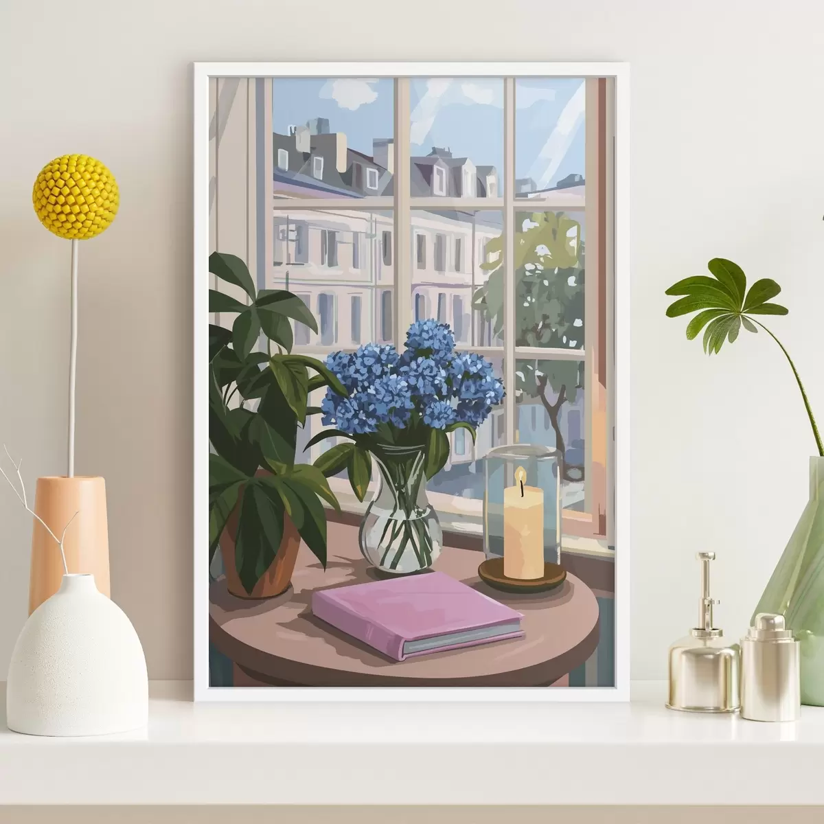 Poster Ortensie nel vaso, vista dalla finestra, candela, casa accogliente f44009