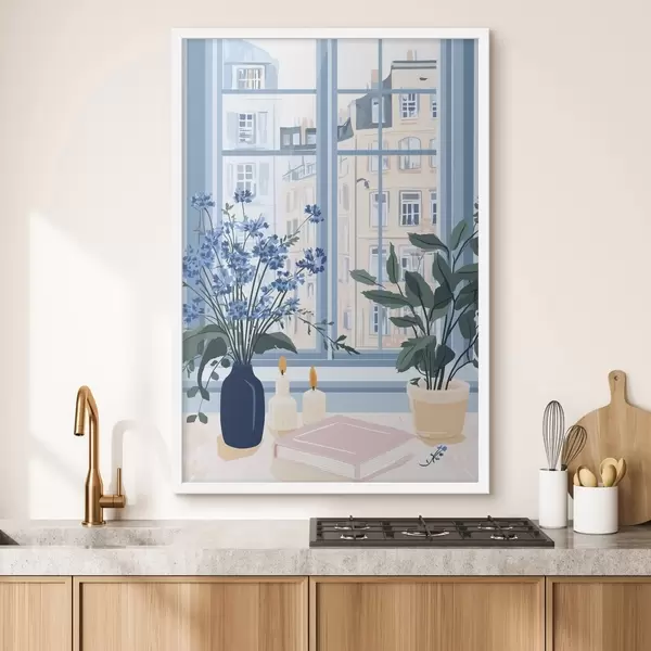 Poster Casa accogliente con fiori e vista sulla finestra, architettura, colori blu Nr f44010