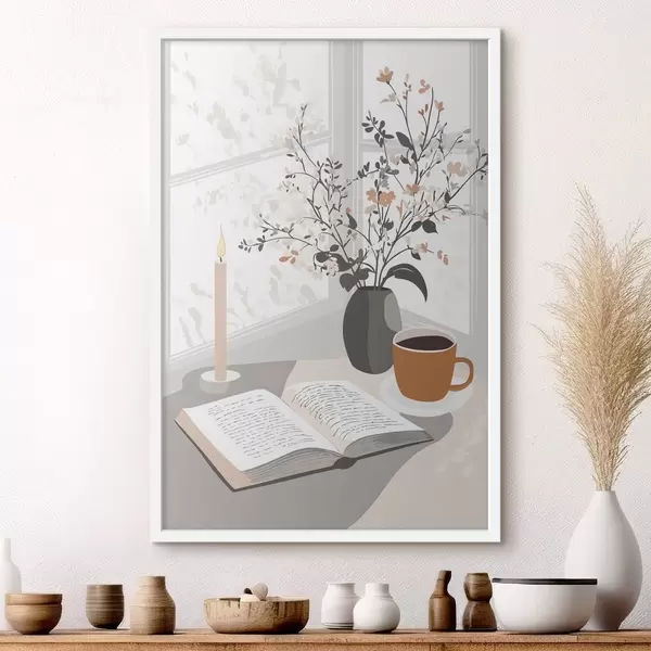 Poster Astrazione, libro aperto, vaso con fiori, candela, colori beige Nr f44011