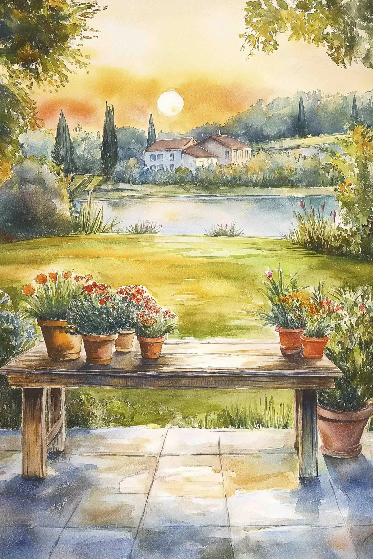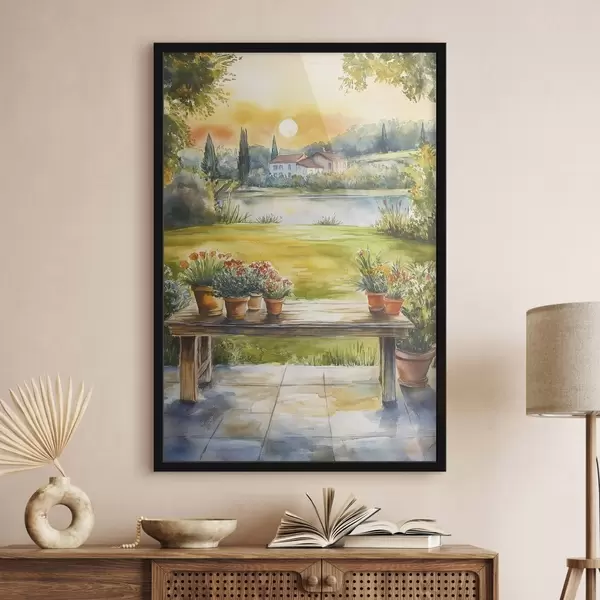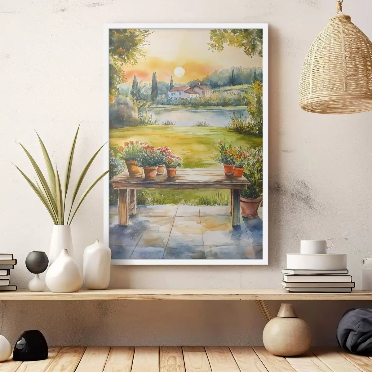 Poster Villaggio al tramonto, rustico, fiori estivi, lago, stile acquerello Nr f44016
