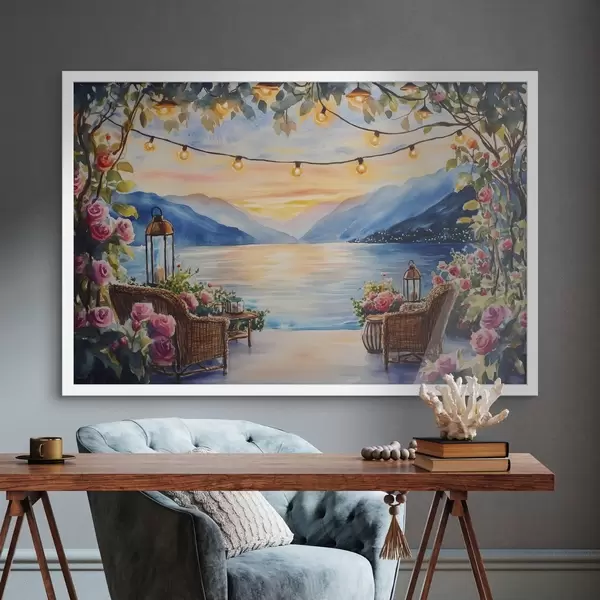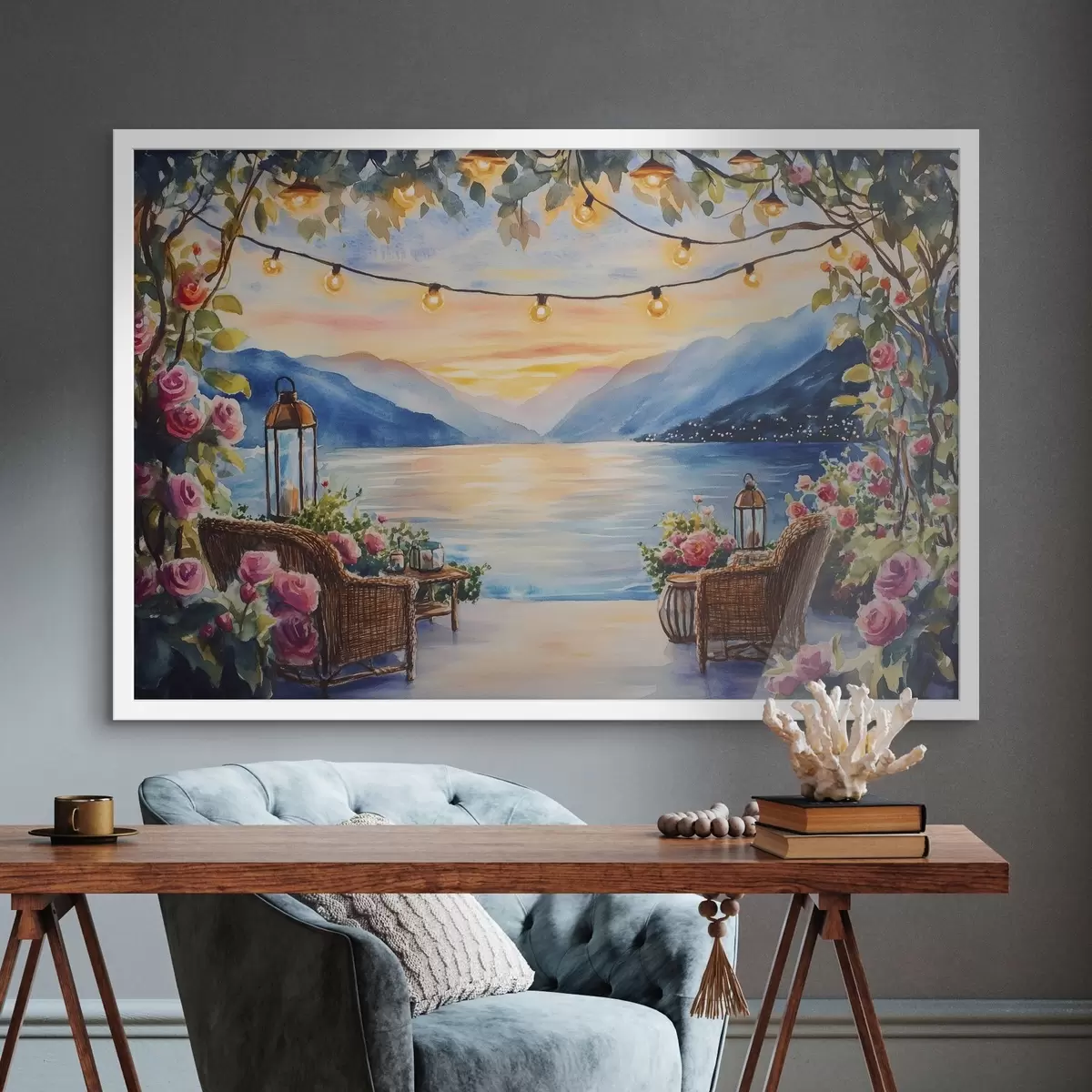 Poster Bellissimo tramonto in montagna, lago, rose, stile boho Nr f44025