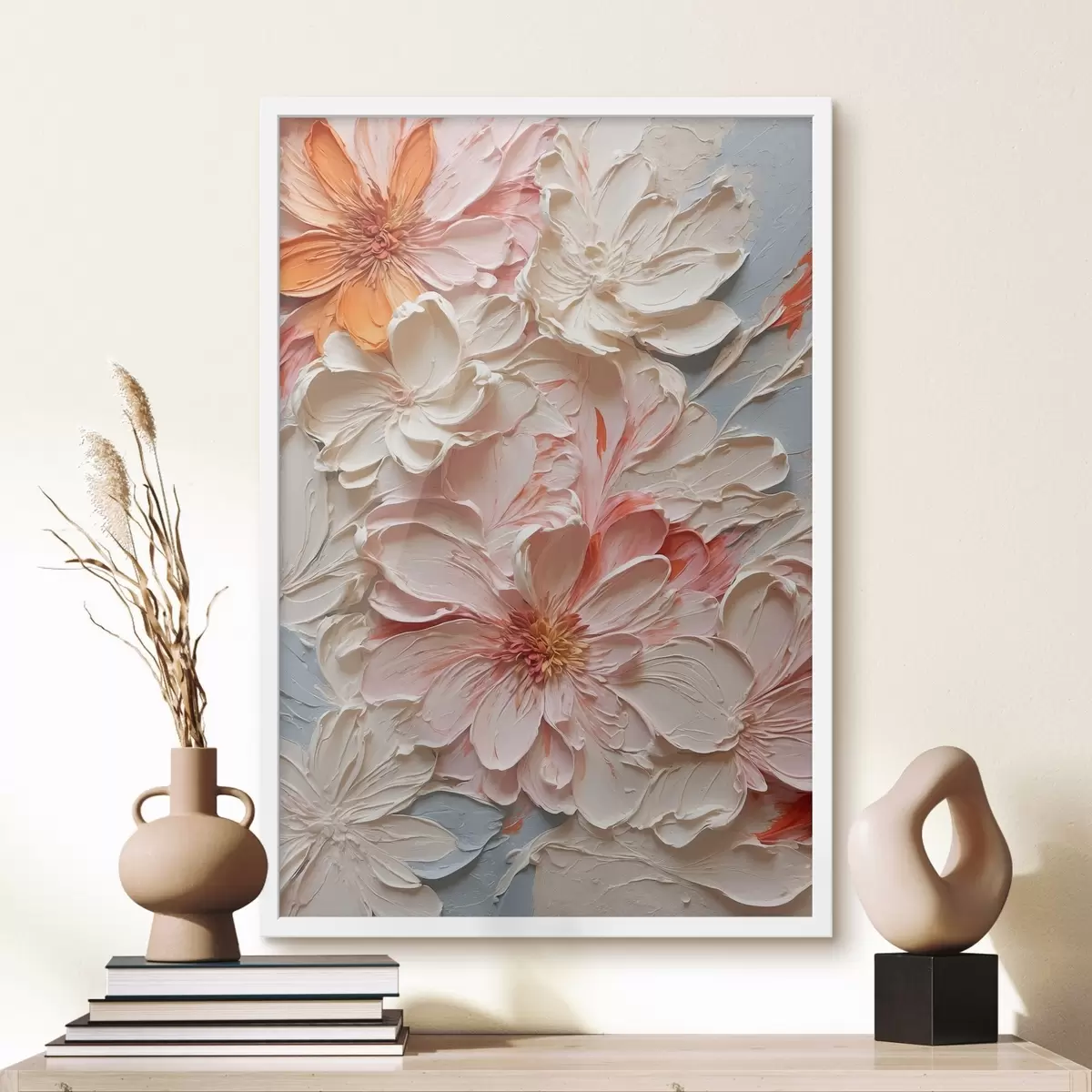 Poster Fiori bianchi e rosa su sfondo blu in stile pittura ad olio Nr f44074