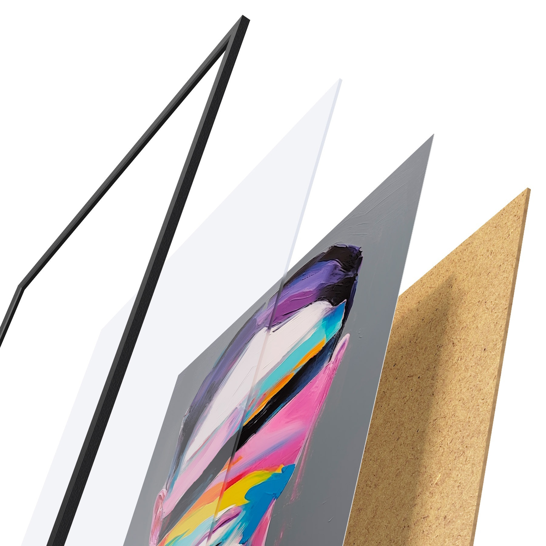 Il poster è composto da cornice, plexiglass, immagine stampata e supporto in truciolato. Il poster può essere immediatamente appeso alla parete grazie ai supporti sul retro.
