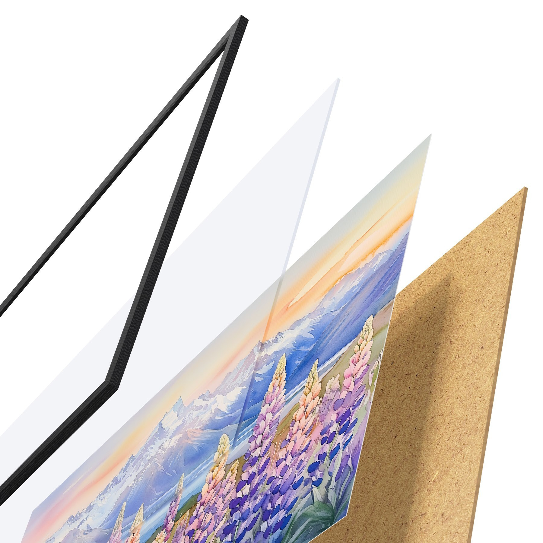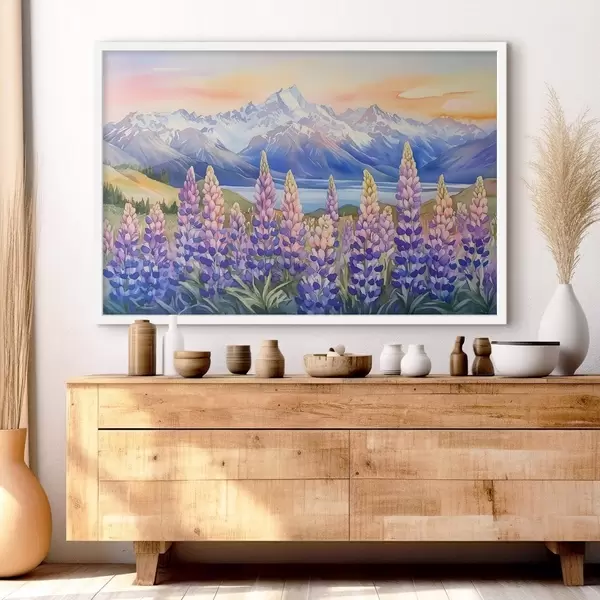 Poster Fiori di lupino, prato, montagne, stile acquerello, cielo al tramonto Nr f44146