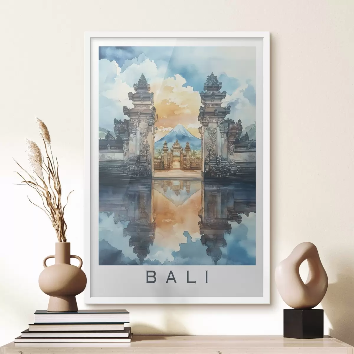 Poster Estetica di Bali, tempio, cielo al tramonto, natura tropicale, stile acquerello Nr f44149