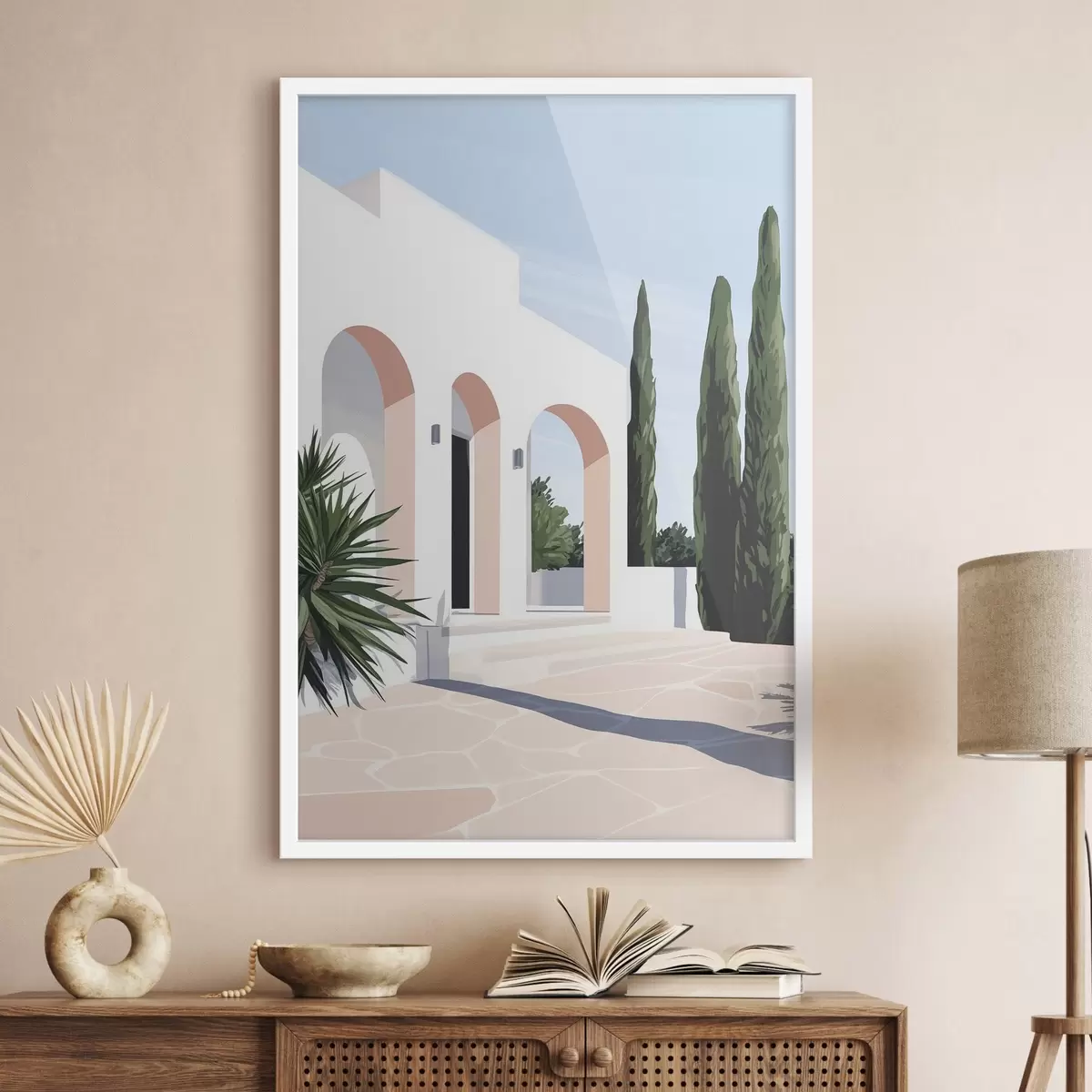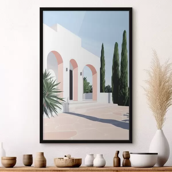 Poster Villa bianca con archi e giardino tropicale, stile mediterraneo e pianeggiante f44153