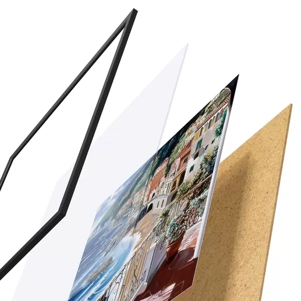 Il poster è composto da cornice, plexiglass, immagine stampata e supporto in truciolato. Il poster può essere immediatamente appeso alla parete grazie ai supporti sul retro.