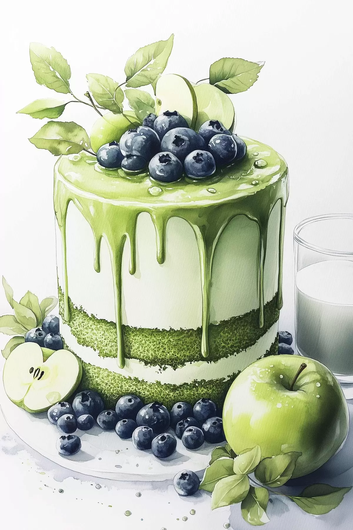Poster Torta Matcha con mirtilli e mele, stile acquerello f44304