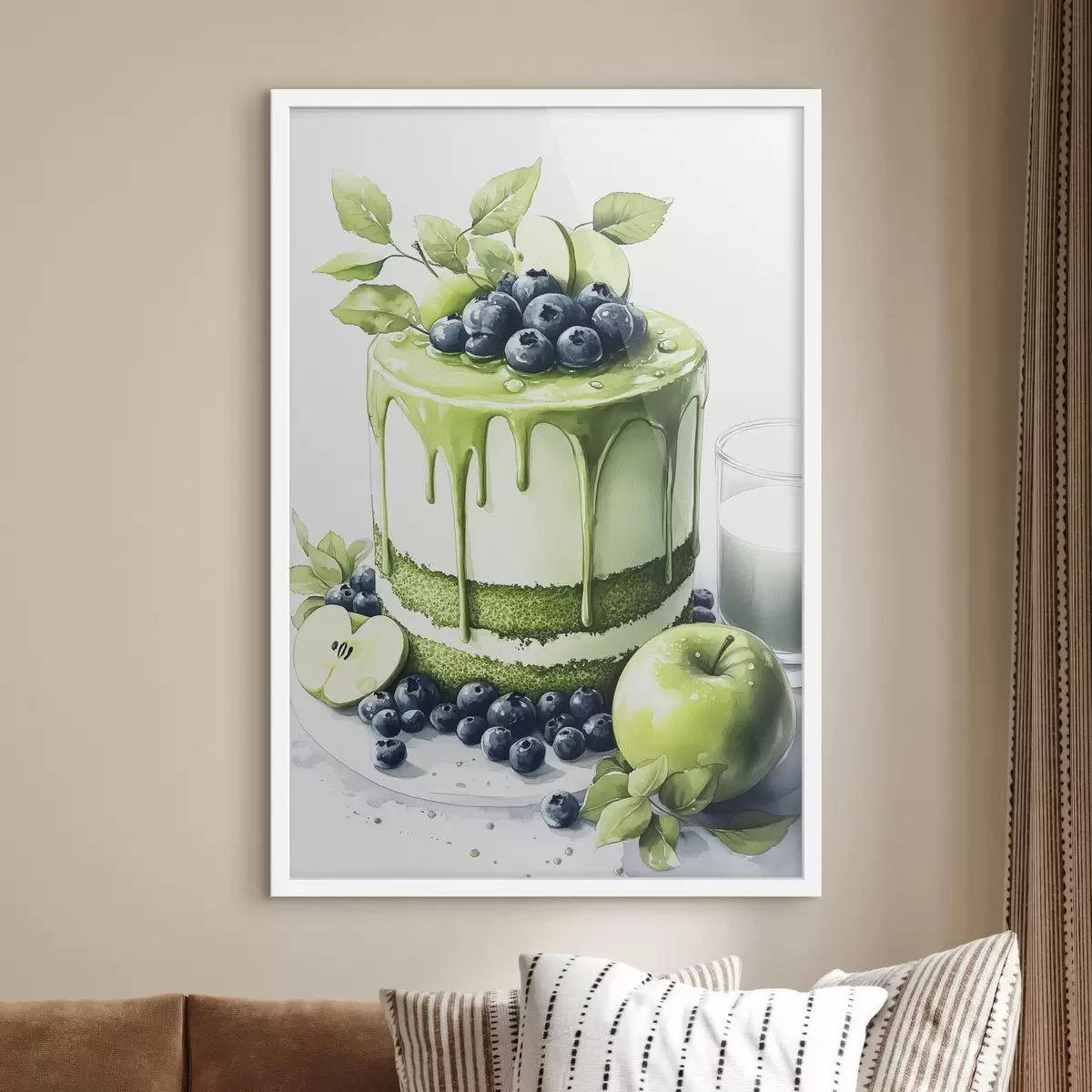 Poster Torta Matcha con mirtilli e mele, stile acquerello Nr f44304