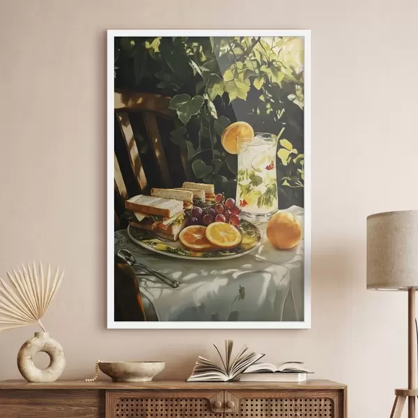 Poster Picnic estetico nel giardino estivo, panini, arance e limonata Nr f44306