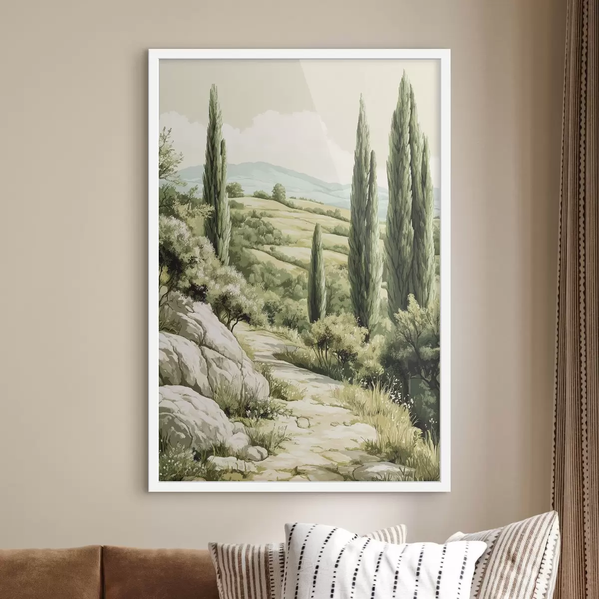 Poster Paesaggi estivi con cipressi e colline verdi, stile rustico Nr f44308