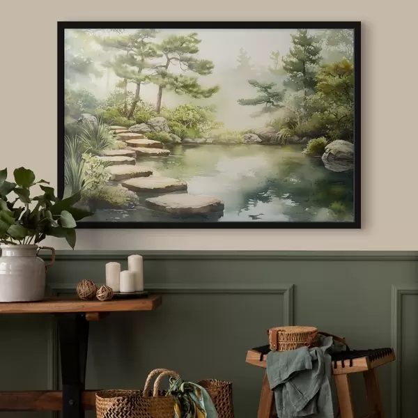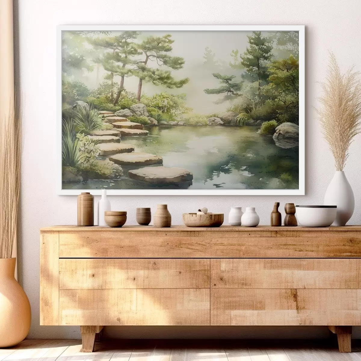 Poster Giardino orientale con lago e alberi, natura, stile acquerello Nr f44313