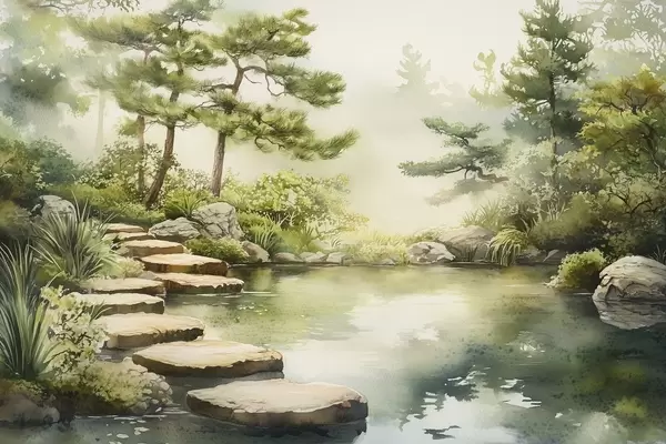 Poster Giardino orientale con lago e alberi, natura, stile acquerello Nr f44313