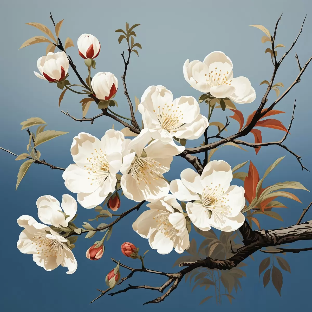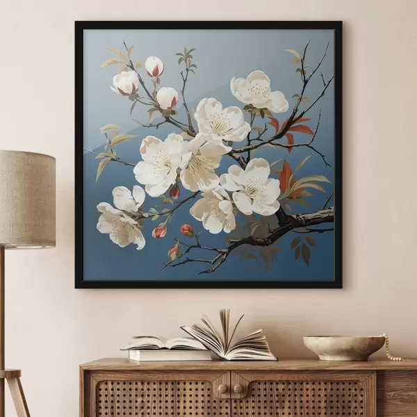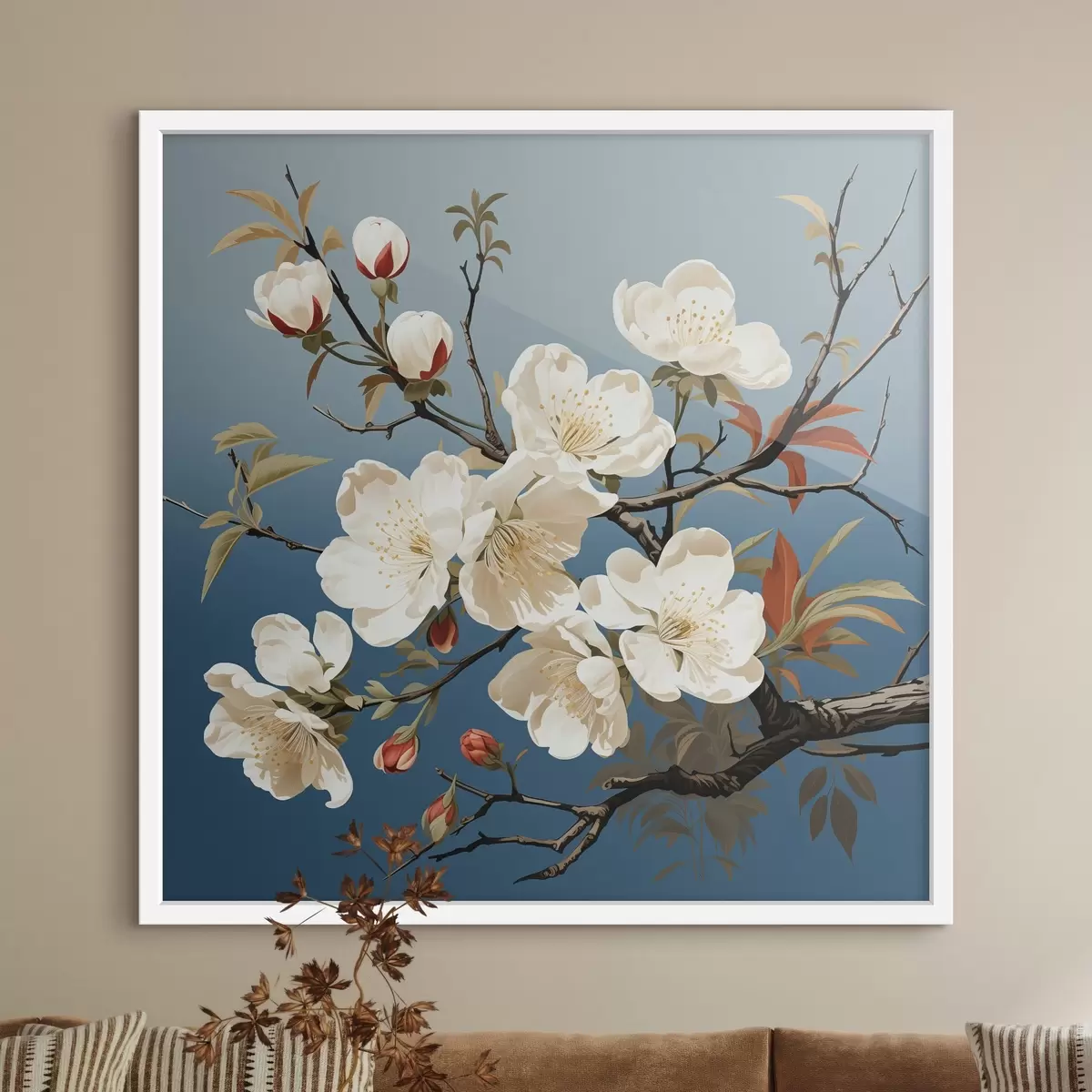Poster Ramo di magnolia con boccioli rossastri su sfondo blu Nr f44341