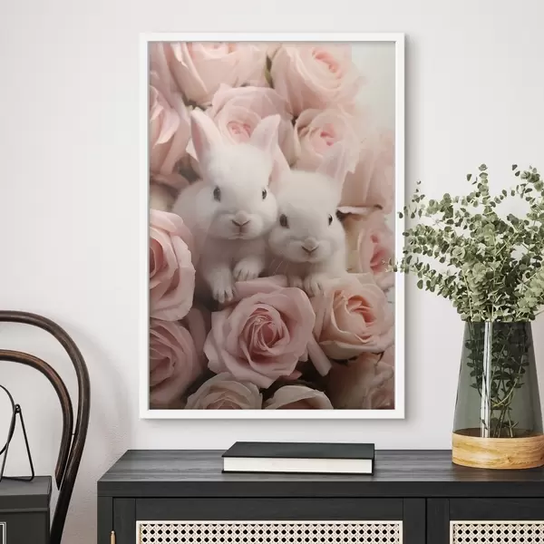 Poster Due conigli bianchi tra delicati fiori di rosa Nr f44380