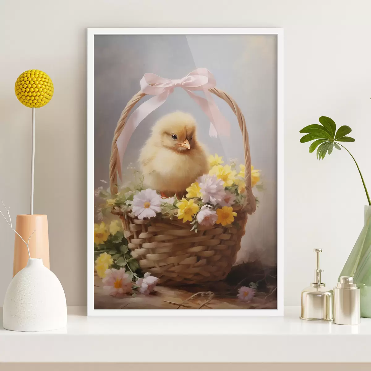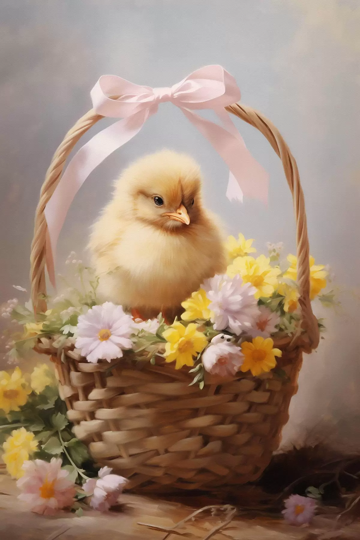 Poster Pulcino giallo in un cesto con fiori di campo Nr f44384