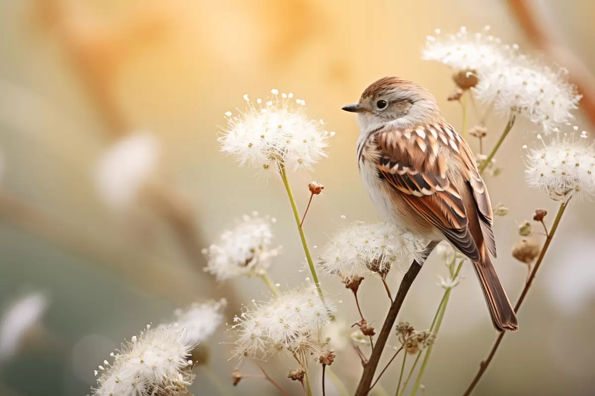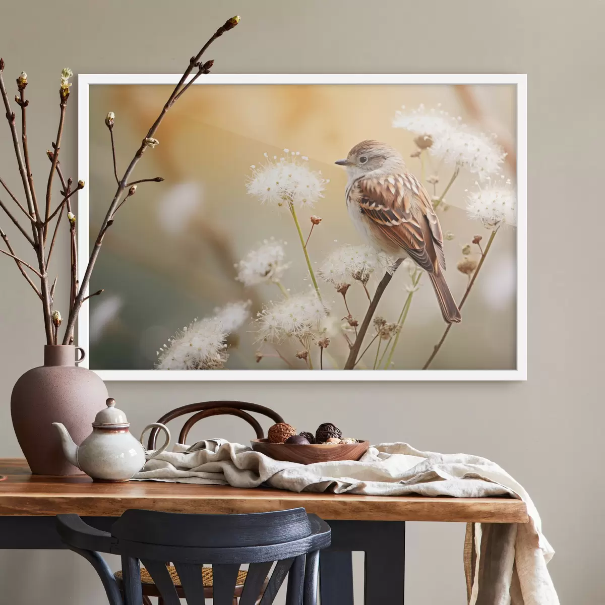 Poster Uccello appollaiato su un ramo con fiori bianchi, soft focus, sfondo naturale f44393