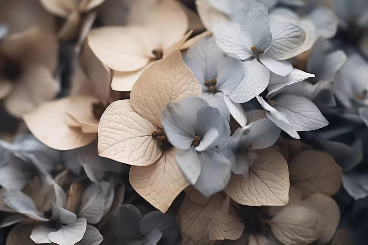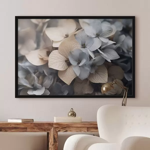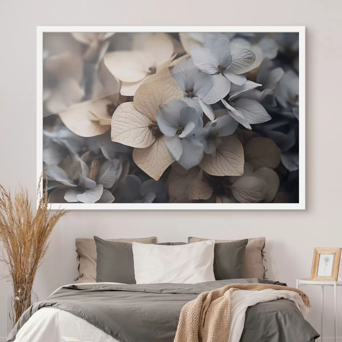 Poster Fiori di ortensia, petali azzurri e beige, con texture dettagliate, composizione floreale elegante Nr f44394