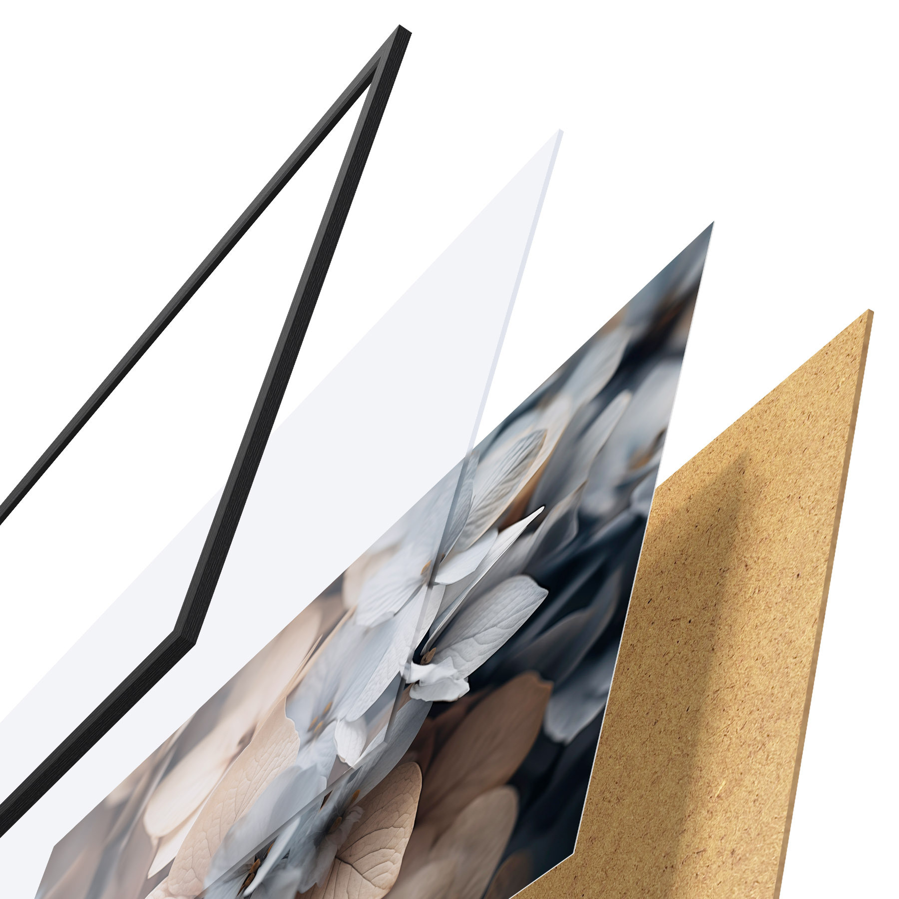 Poster Fiori di ortensia, petali azzurri e beige, con texture dettagliate, composizione floreale elegante f44394