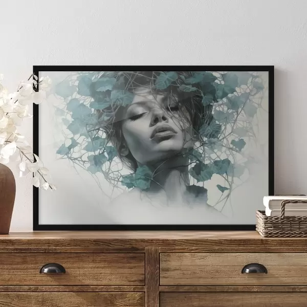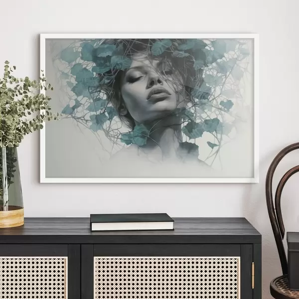 Poster Ritratto di donna con gli occhi chiusi, circondata da foglie e rami verdi Nr f44399