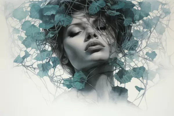 Poster Ritratto di donna con gli occhi chiusi, circondata da foglie e rami verdi Nr f44399