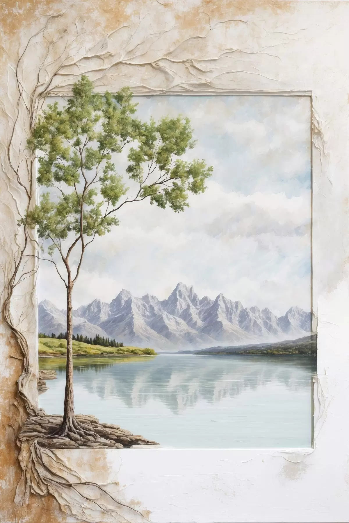 Poster Vista sul lago e montagne innevate nell'inquadratura Nr f44458