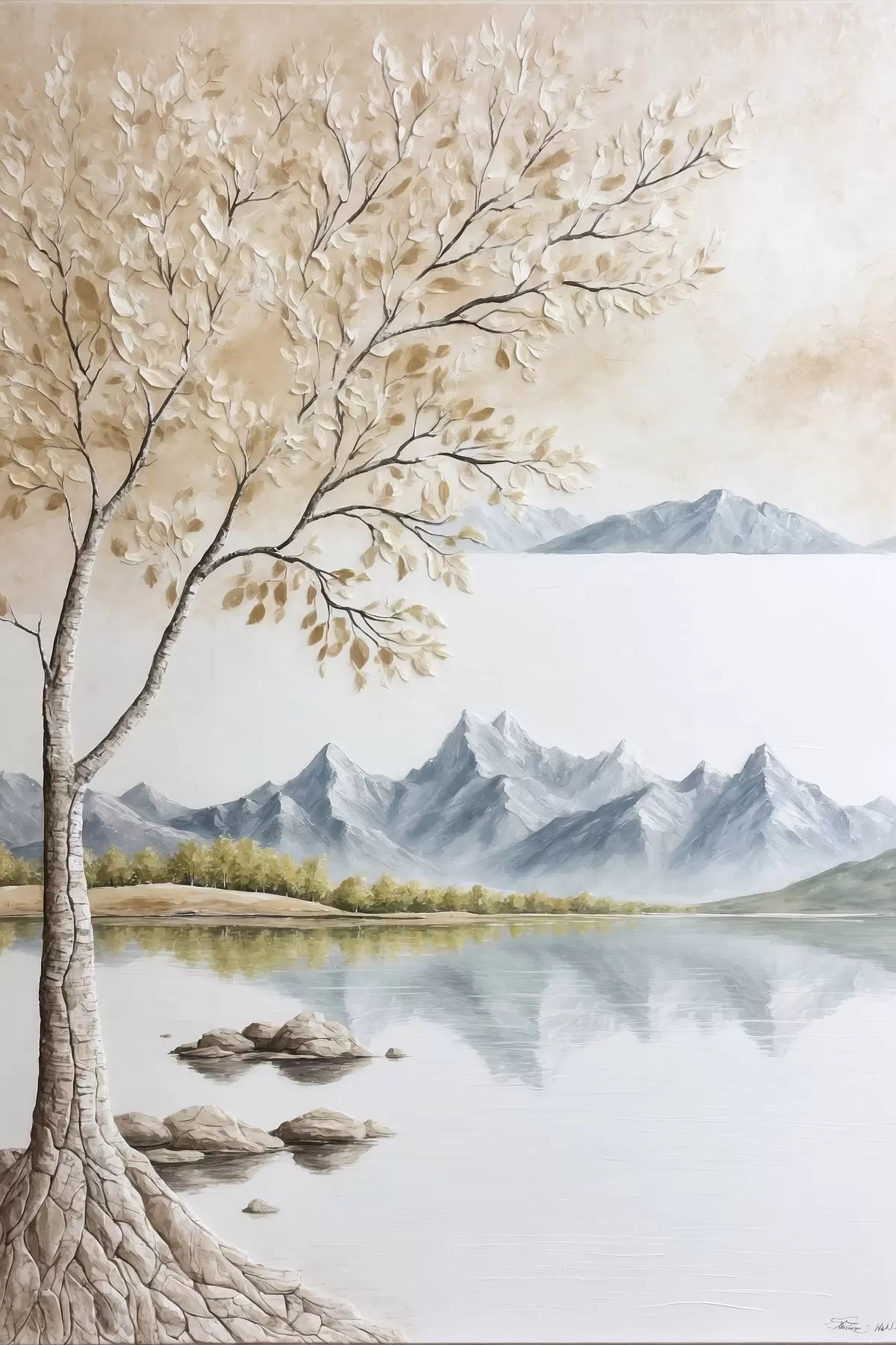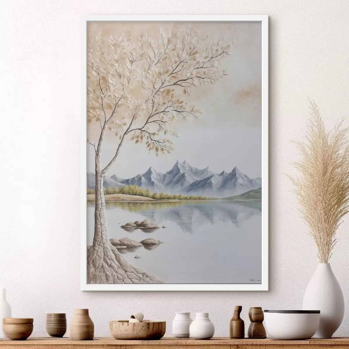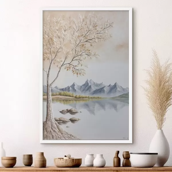 Poster Albero su lago e sfondo di montagne innevate Nr f44459