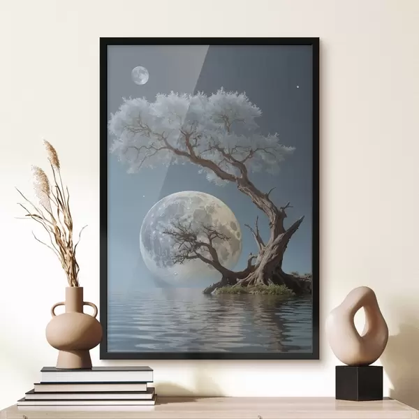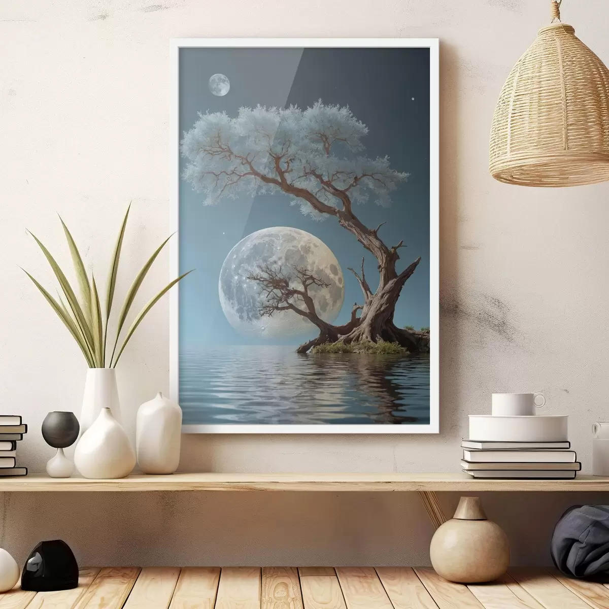 Poster Albero che cresce in mezzo a un lago su sfondo lunare Nr f44481