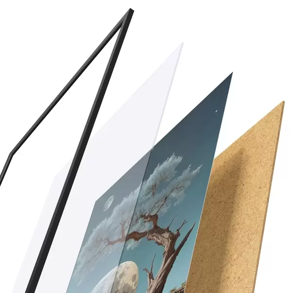 Il poster è composto da cornice, plexiglass, immagine stampata e supporto in truciolato. Il poster può essere immediatamente appeso alla parete grazie ai supporti sul retro.