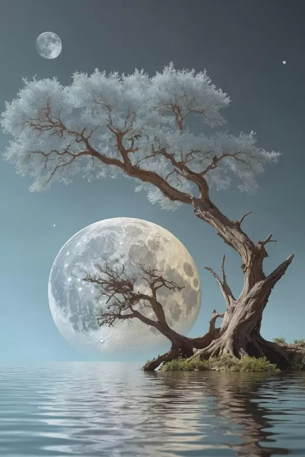 Poster Albero che cresce in mezzo a un lago su sfondo lunare Nr f44481
