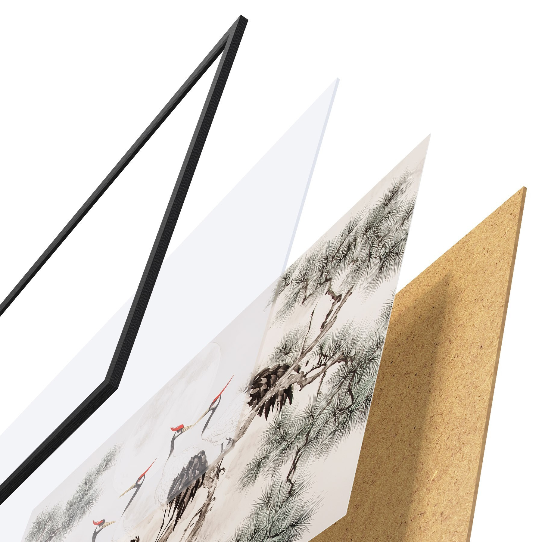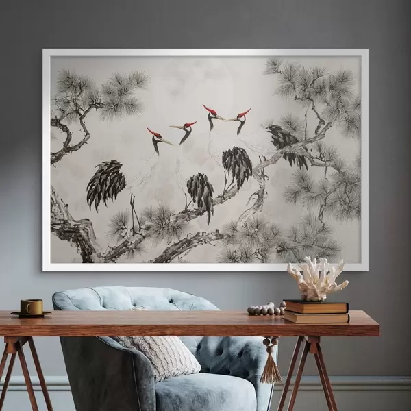 Poster Arte cinese con gru e pini, stile orientale, natura Nr f44503