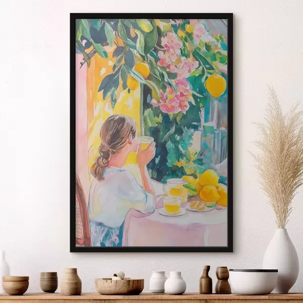 Poster Vibrazioni estive, ragazza al caffè, limoncello, Italia, stile acquerello Nr f44505