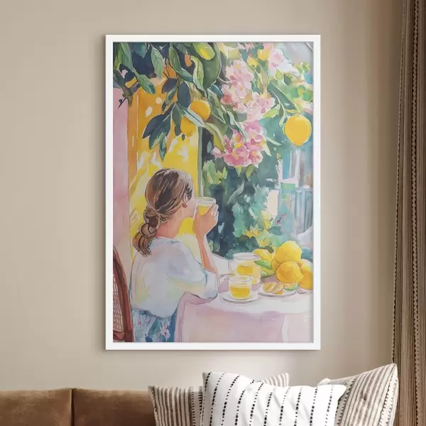 Poster Vibrazioni estive, ragazza al caffè, limoncello, Italia, stile acquerello f44505