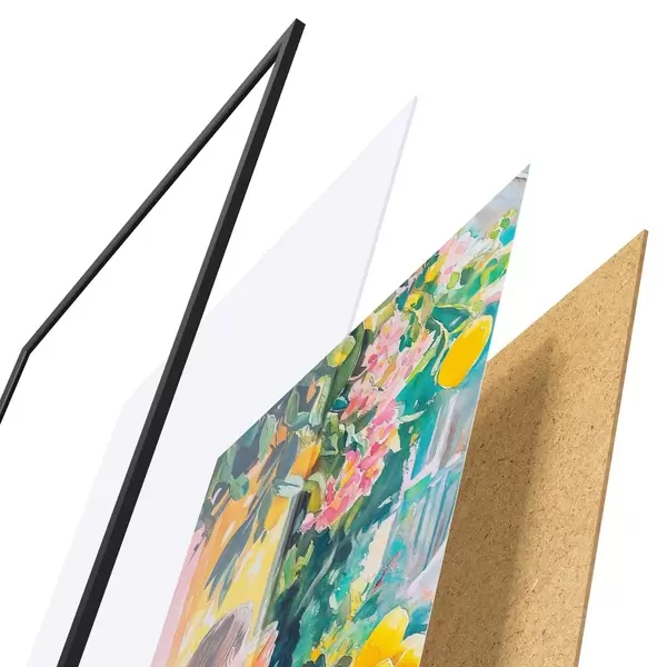 Il poster è composto da cornice, plexiglass, immagine stampata e supporto in truciolato. Il poster può essere immediatamente appeso alla parete grazie ai supporti sul retro.