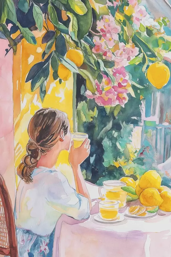 Poster Vibrazioni estive, ragazza al caffè, limoncello, Italia, stile acquerello f44505