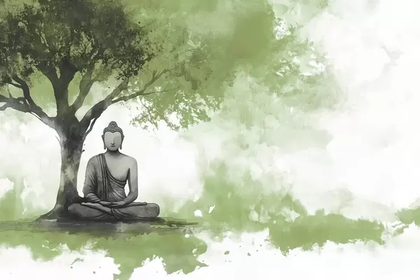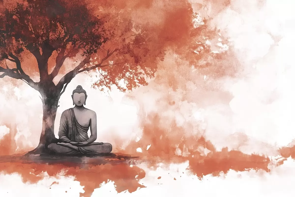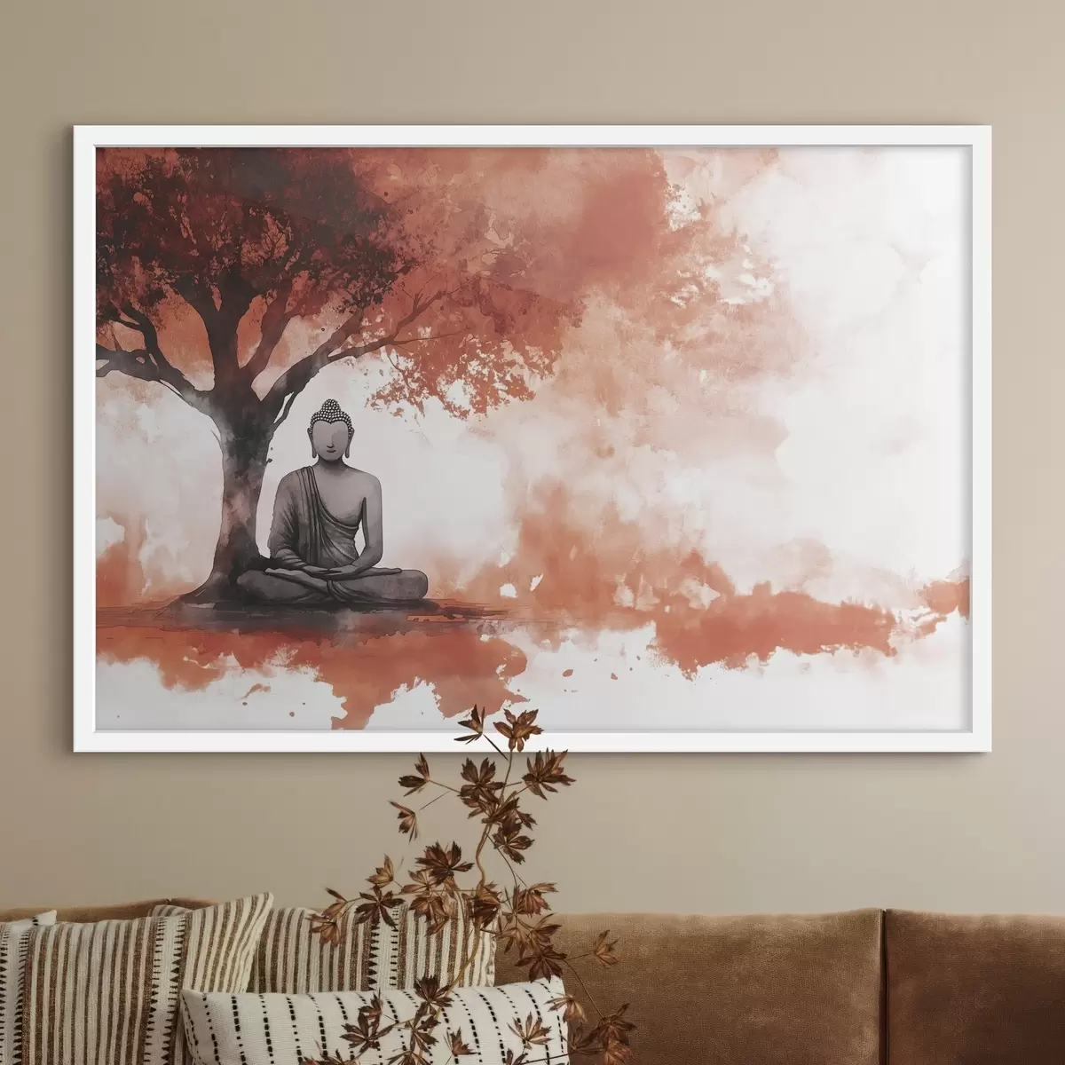 Poster Buddha seduto sotto l'albero, meditazione, spirituale, colori arancioni Nr f44512