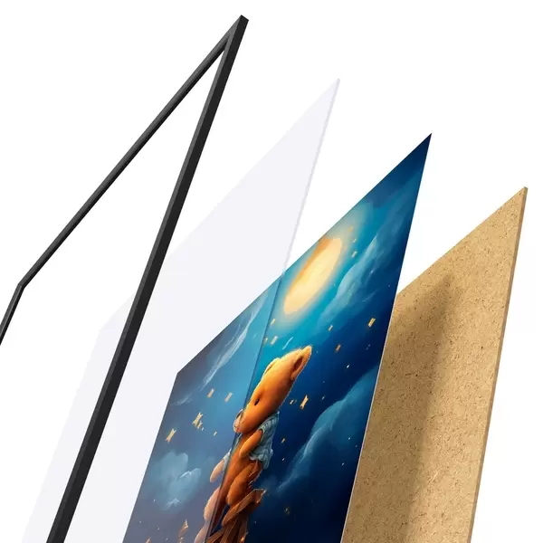 Il poster è composto da cornice, plexiglass, immagine stampata e supporto in truciolato. Il poster può essere immediatamente appeso alla parete grazie ai supporti sul retro.