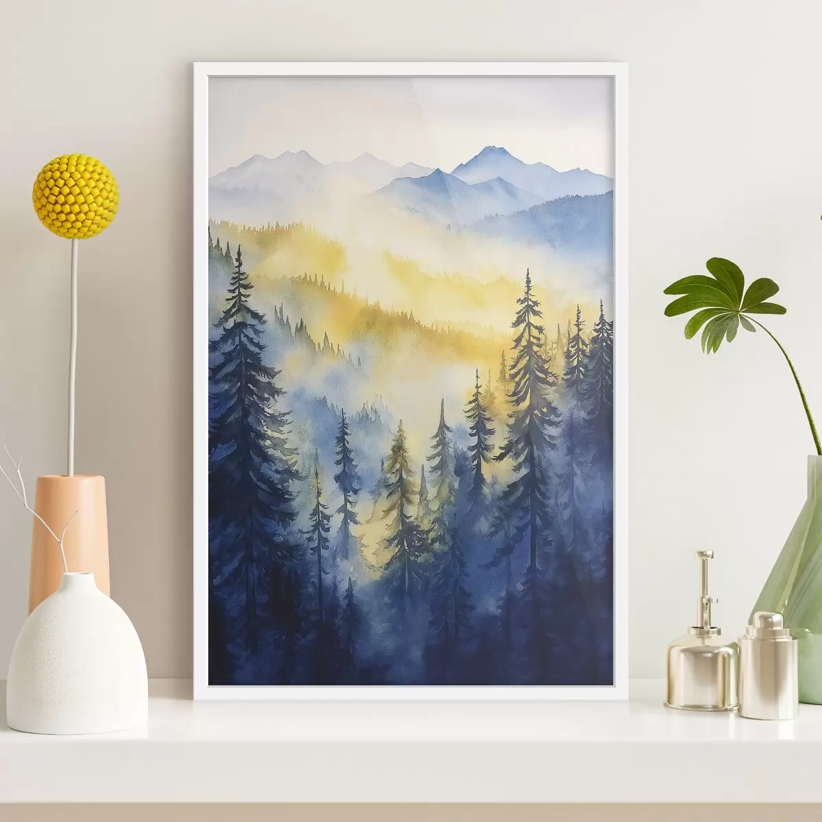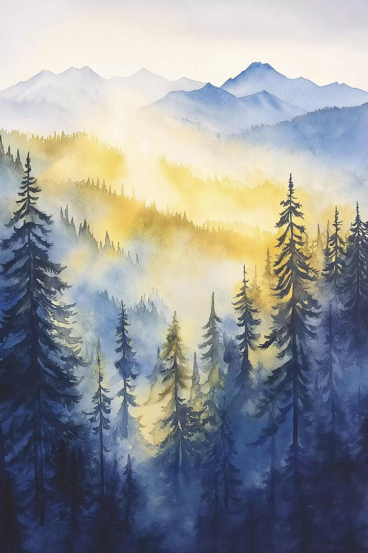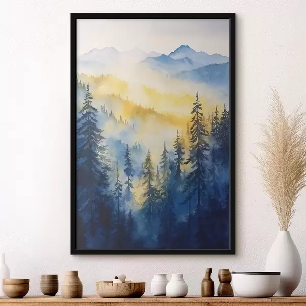 Poster Montagne nebbiose all'alba, foreste di pini, colori blu e giallo Nr f44602