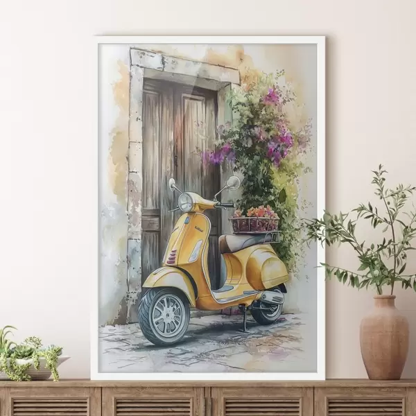 Poster Scooter giallo Vespa vicino a porta di legno con fiori Nr f44607