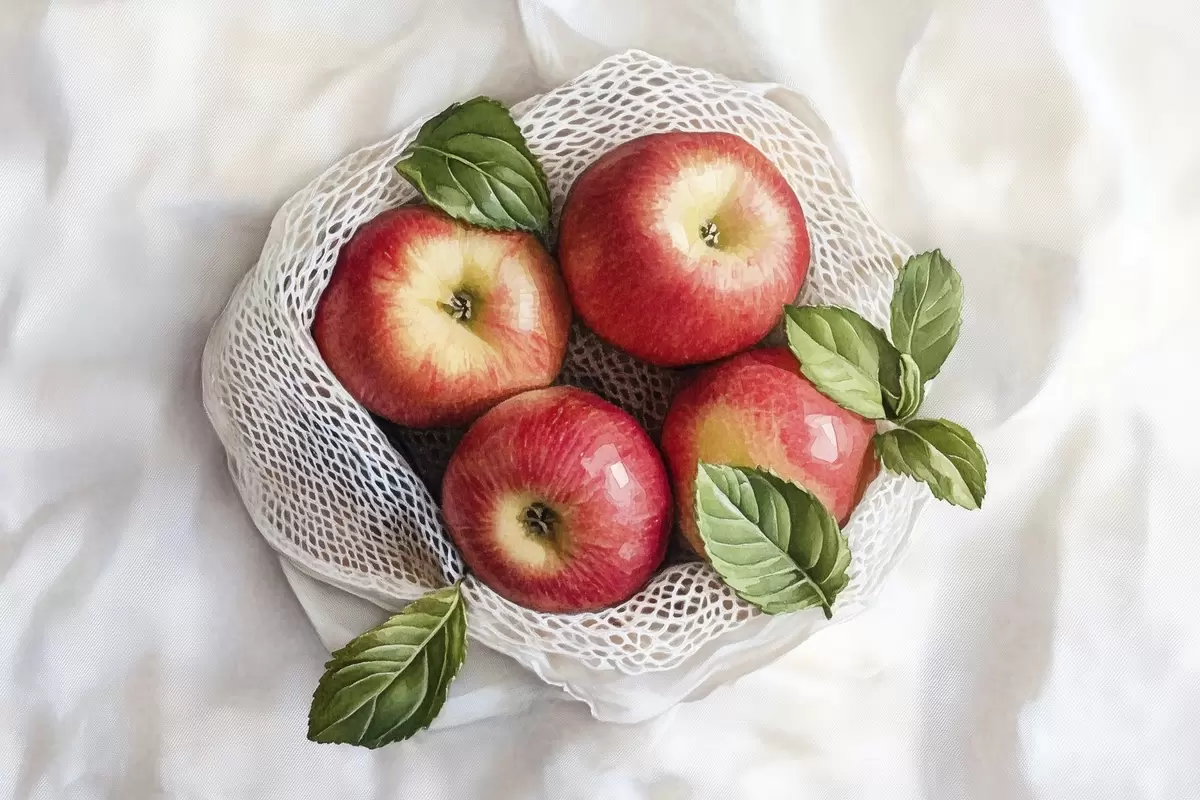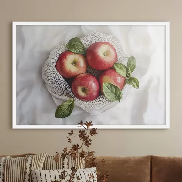 Poster Mele rosse nel sacchetto di lino con foglie di menta, stile rustico, frutta Nr f44609