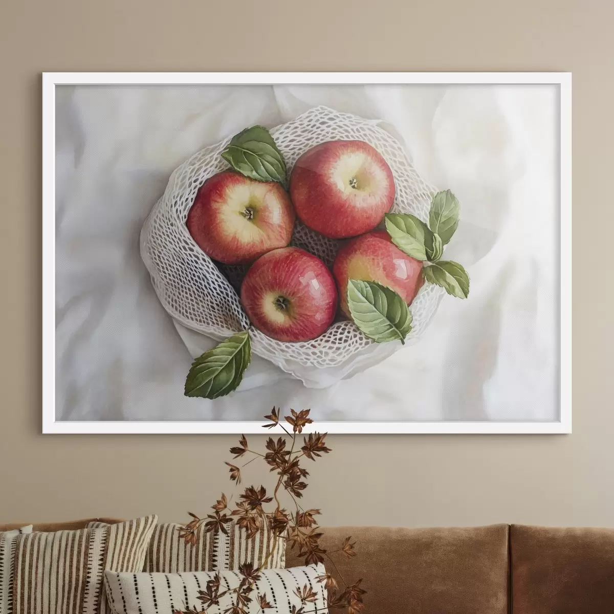 Poster Mele rosse nel sacchetto di lino con foglie di menta, stile rustico, frutta f44609