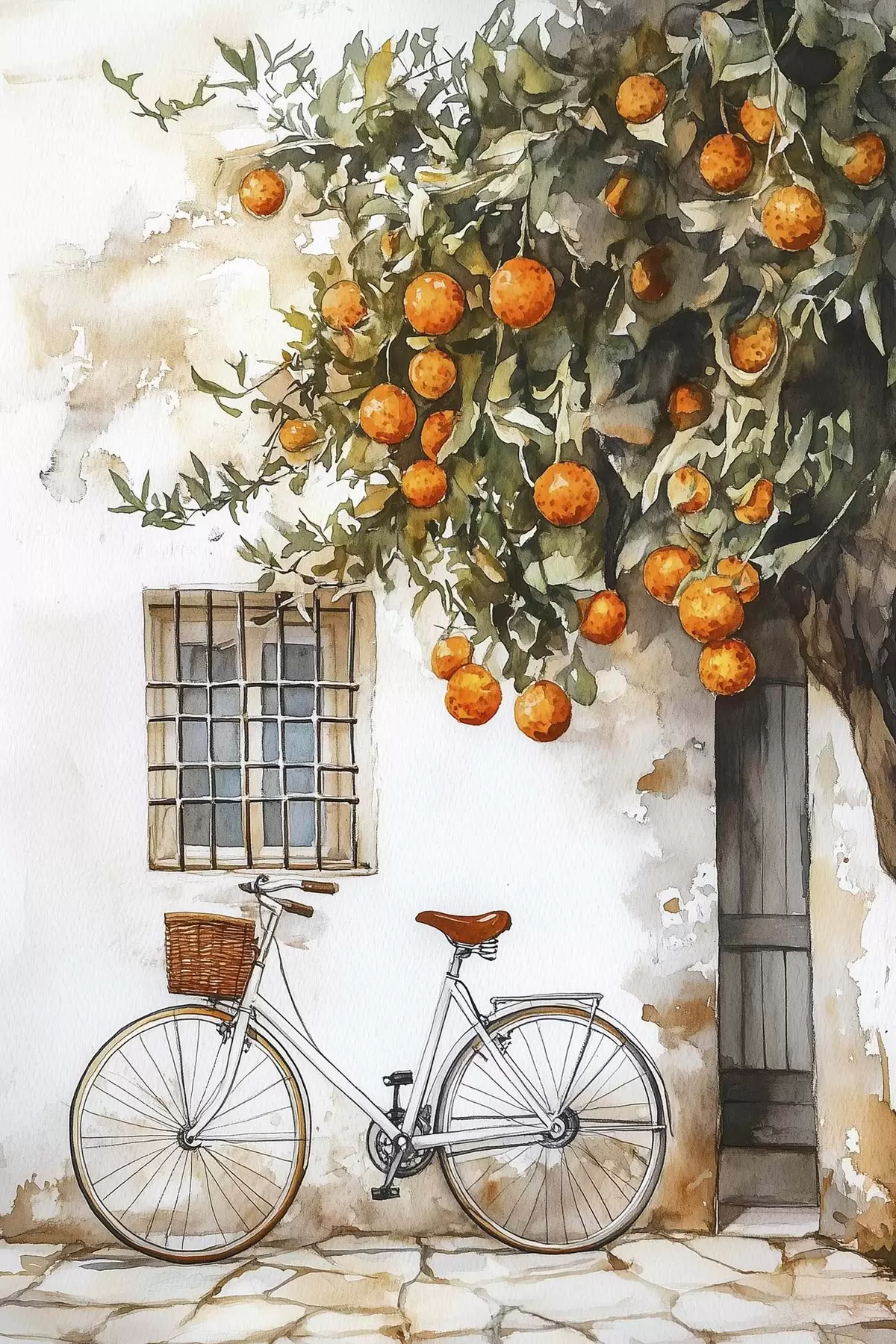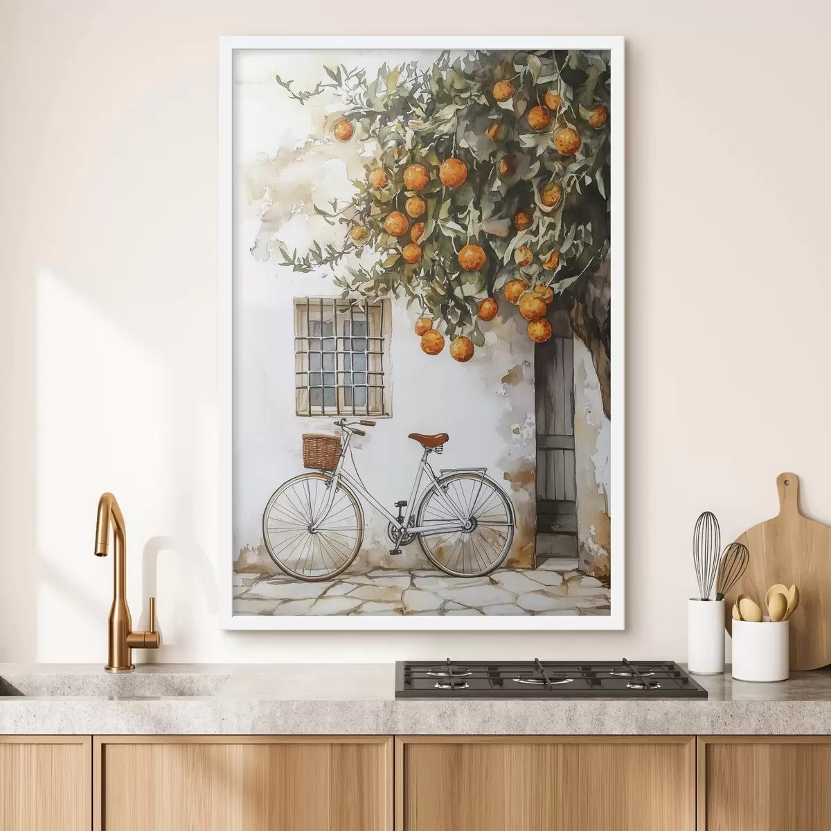 Poster Casa bianca mediterranea con arancio e bicicletta Nr f44610