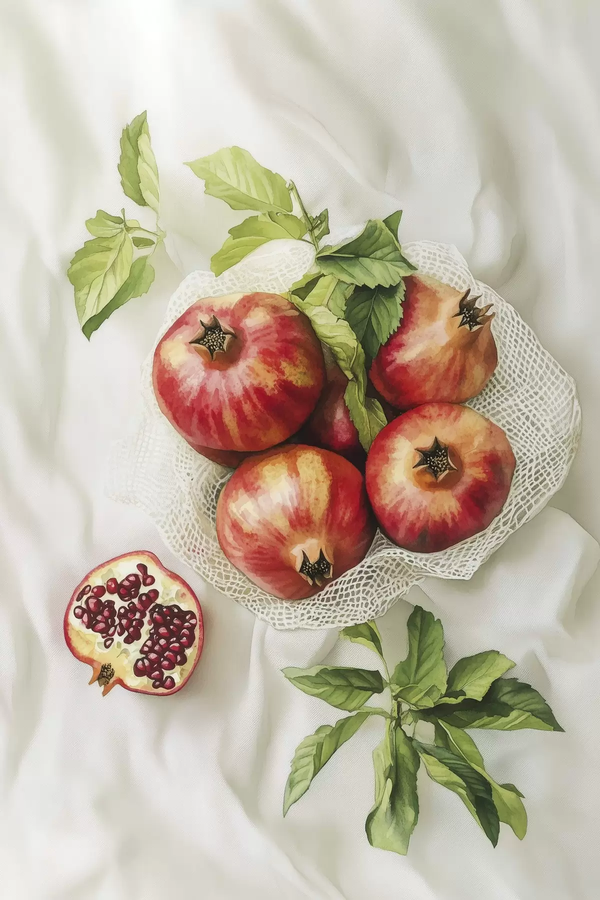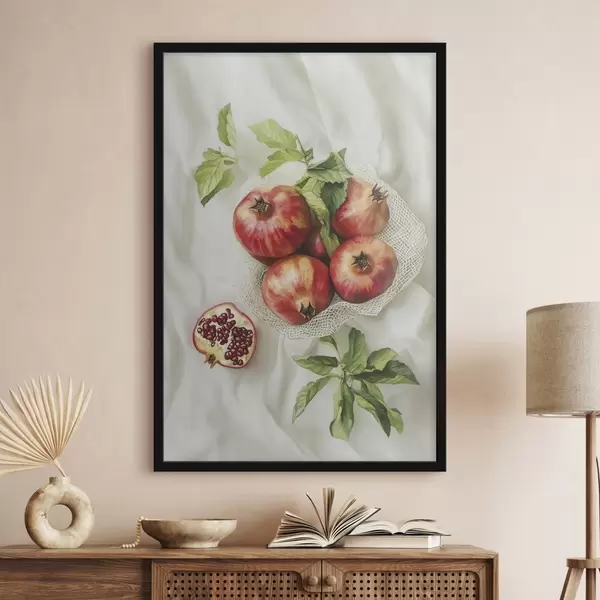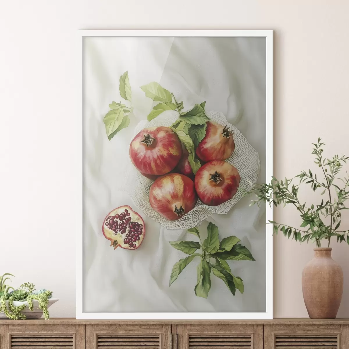 Poster Melograni con foglie di menta sulle tovaglie di lino, stile rustico Nr f44611