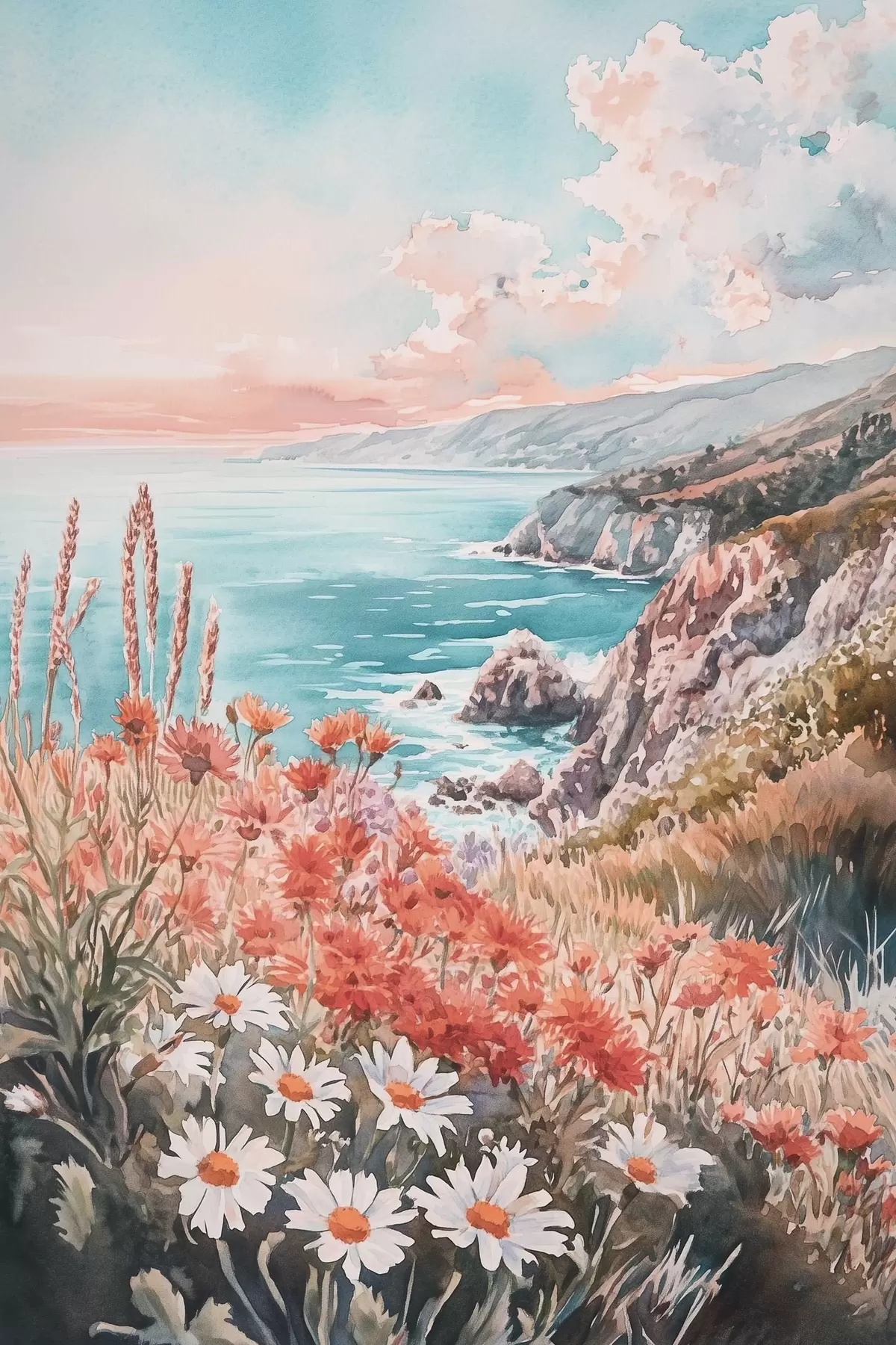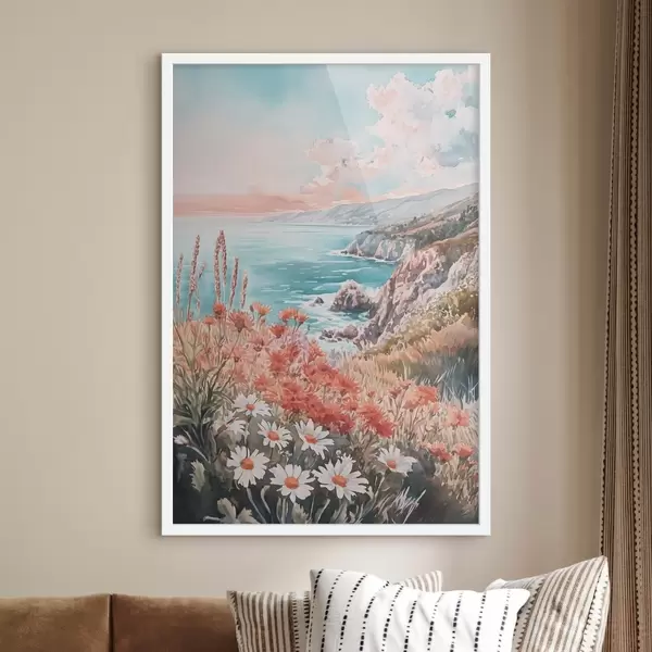 Poster Portogallo costa oceanica al tramonto, fiori di prato f44612
