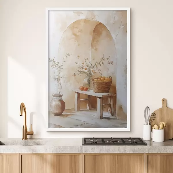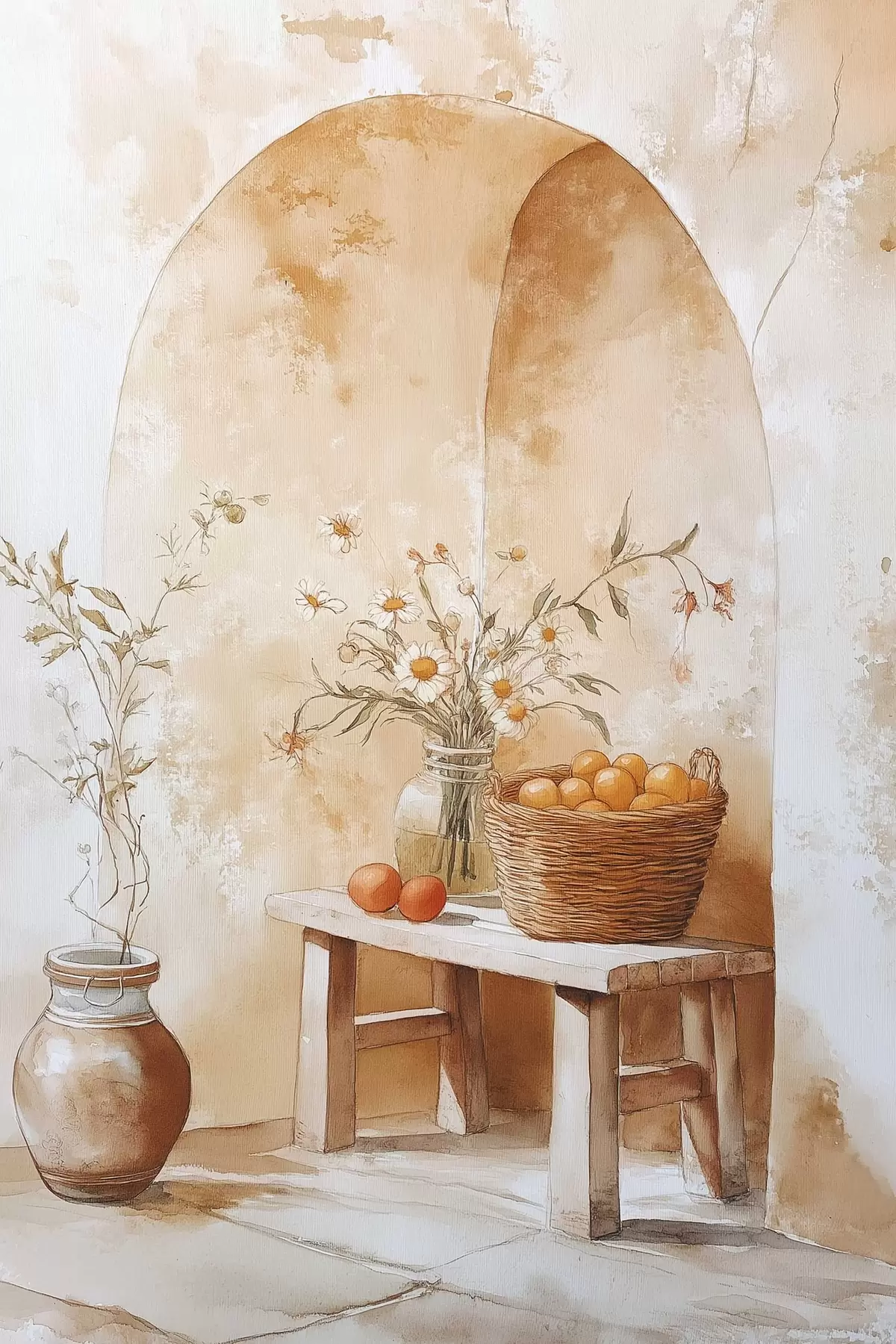Poster Arco a muro con vaso antico, fiori di camomilla e cesto di arance Nr f44613