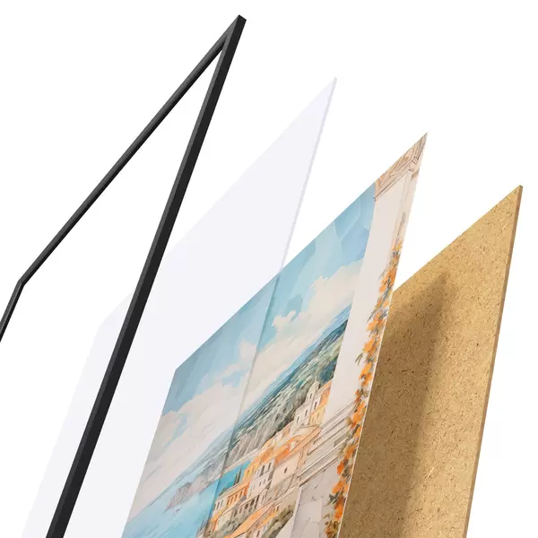 Il poster è composto da cornice, plexiglass, immagine stampata e supporto in truciolato. Il poster può essere immediatamente appeso alla parete grazie ai supporti sul retro.