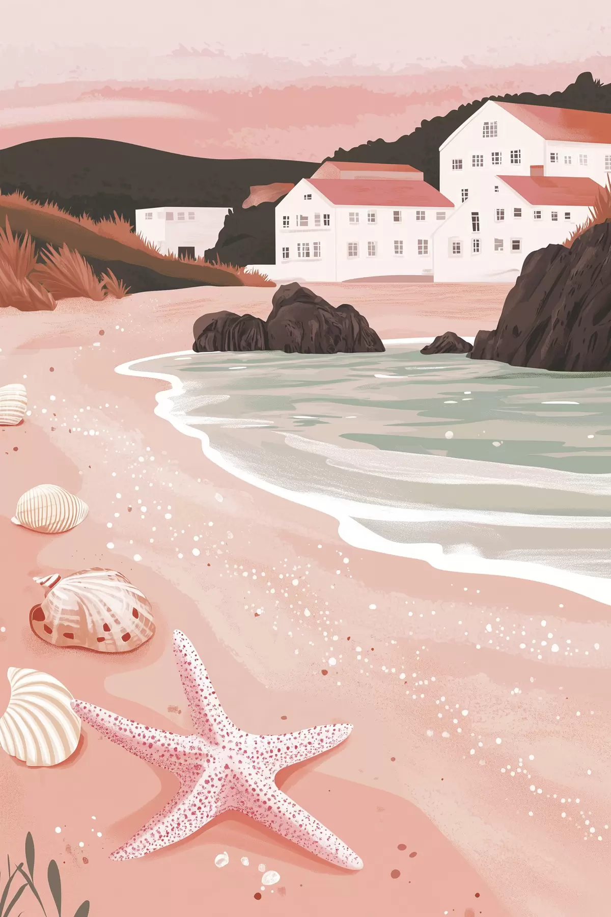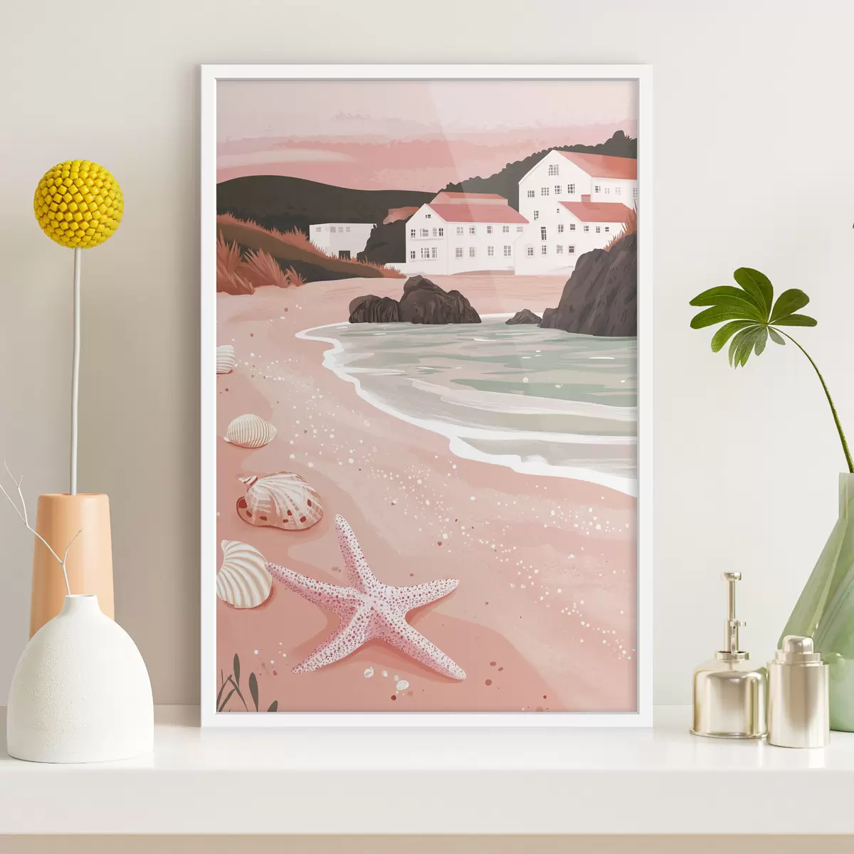 Poster Accogliente spiaggia rosa con case bianche e conchiglie Nr f44713