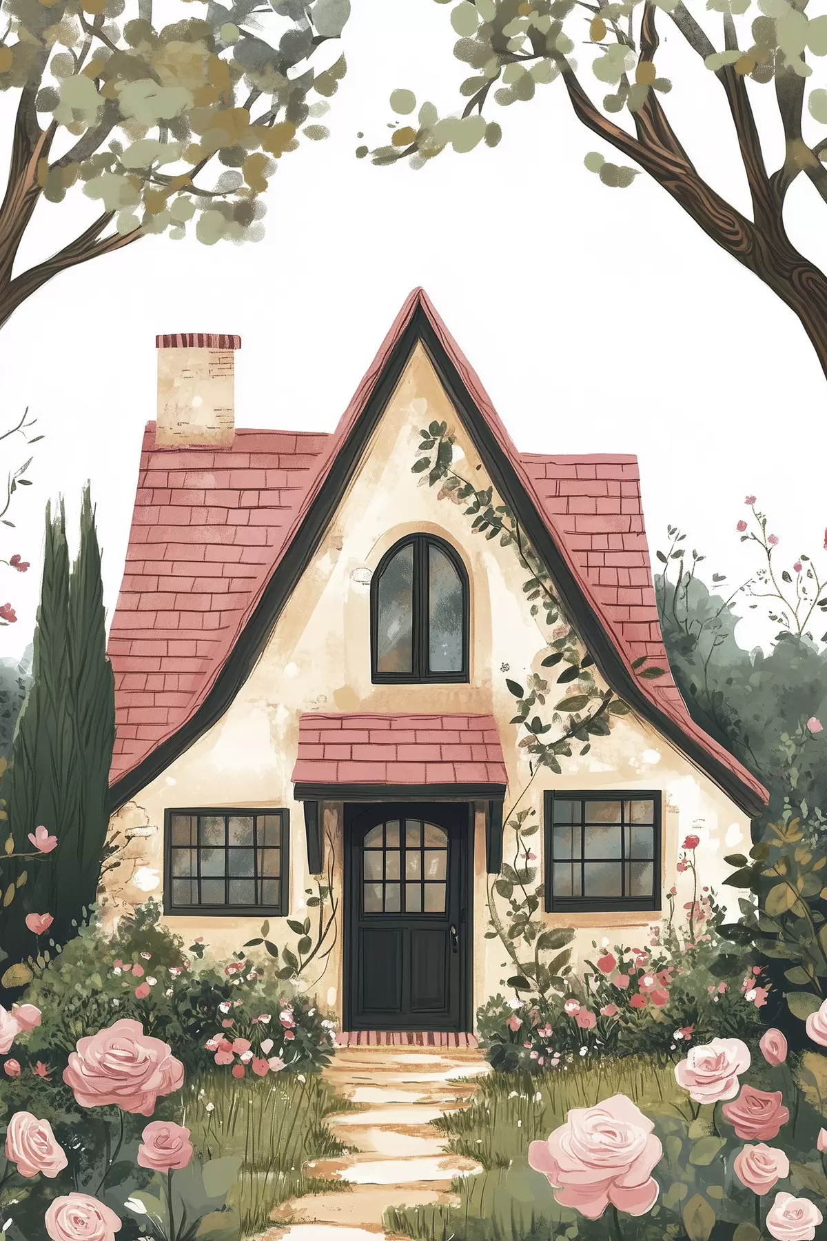 Poster Una casa da favola nel bosco, rose, stile pastello Nr f44718