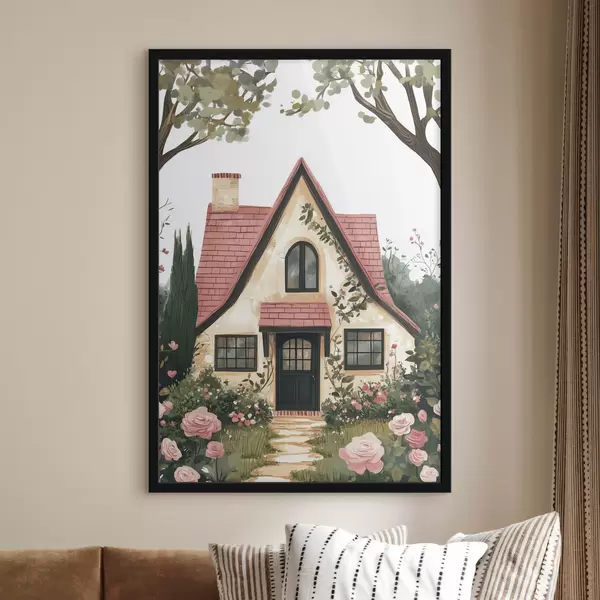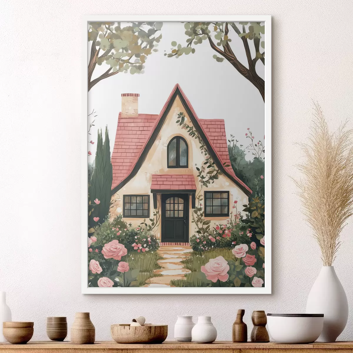 Poster Una casa da favola nel bosco, rose, stile pastello f44718