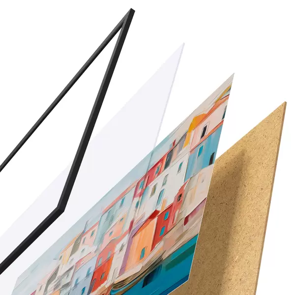 Il poster è composto da cornice, plexiglass, immagine stampata e supporto in truciolato. Il poster può essere immediatamente appeso alla parete grazie ai supporti sul retro.
